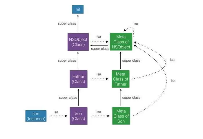 Meta Class的super class指针指向它原本Class的Super Class的Meta Class(这里最上层的NSObject的Meta Class的super class指针还是指向自己) - 最上层的