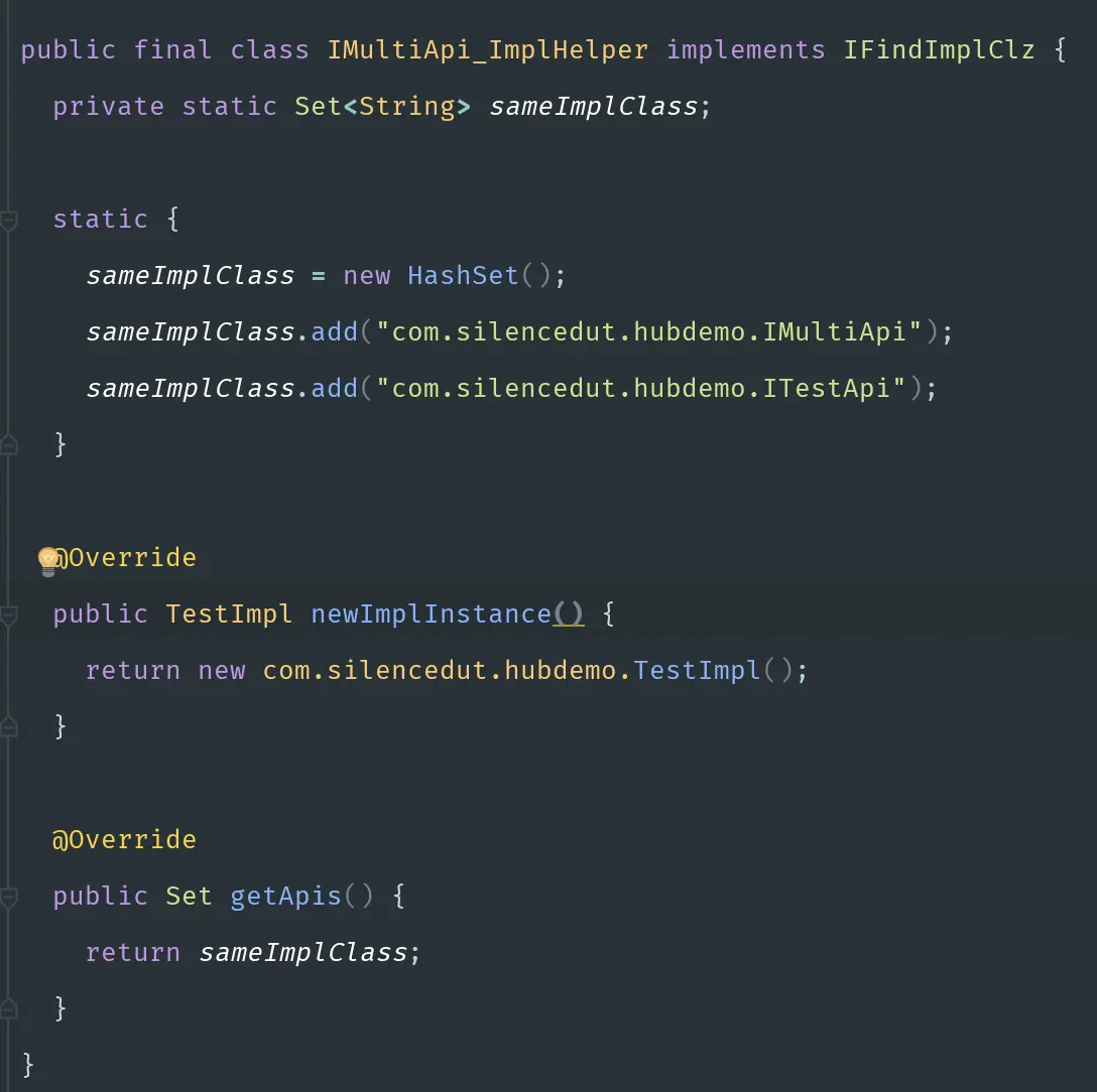 - 尽量少的生成类和反射,实现Hub的过程中为了减少运行期反射的使用,尽可能少的生成一些帮助类,在通过接口得到服务类的时候直接返回对象而不是Class,这样可以尽量避免反射生成对象的所带来的消耗。