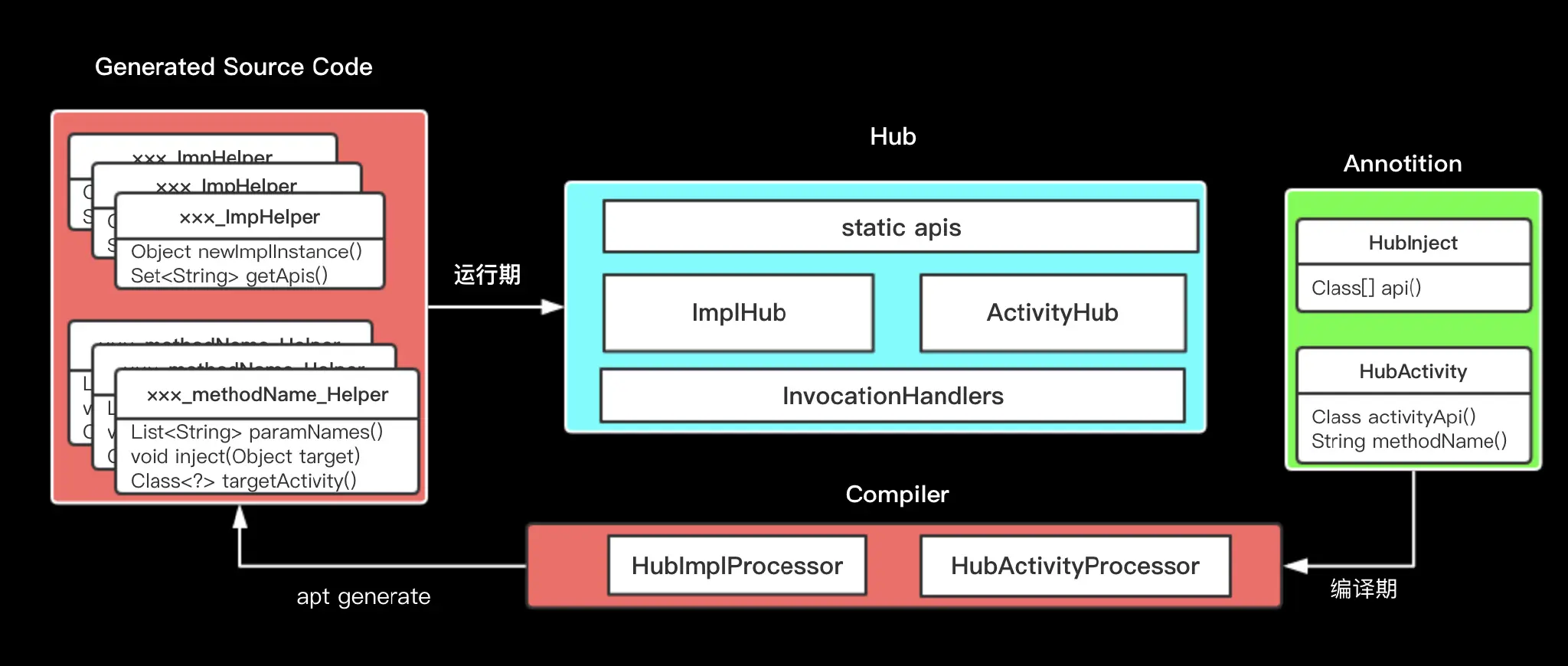 上图是Hub库的总体框架图,代码主要包括4个部分,Annotation主要是注解部分,Compiler是在编译期处理注解,控制反转主要是在这里实现,Hub是提供接口和运行期逻辑控制中心,还有就是通过apt在编译期生成的类,这些类的功能时帮助运行期通过接口和其他信息来找到相应的实现。