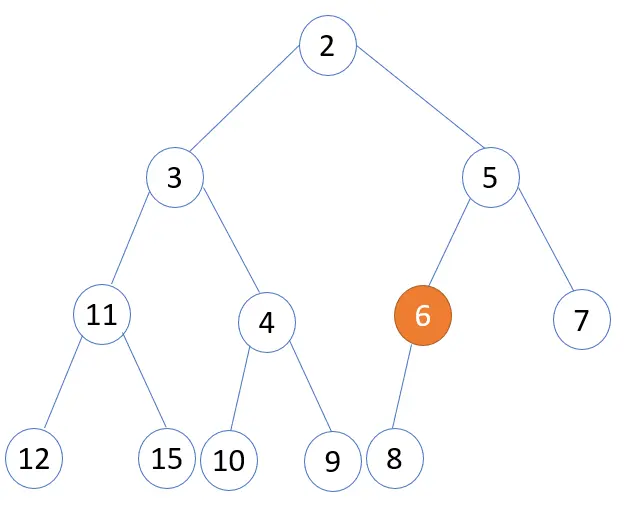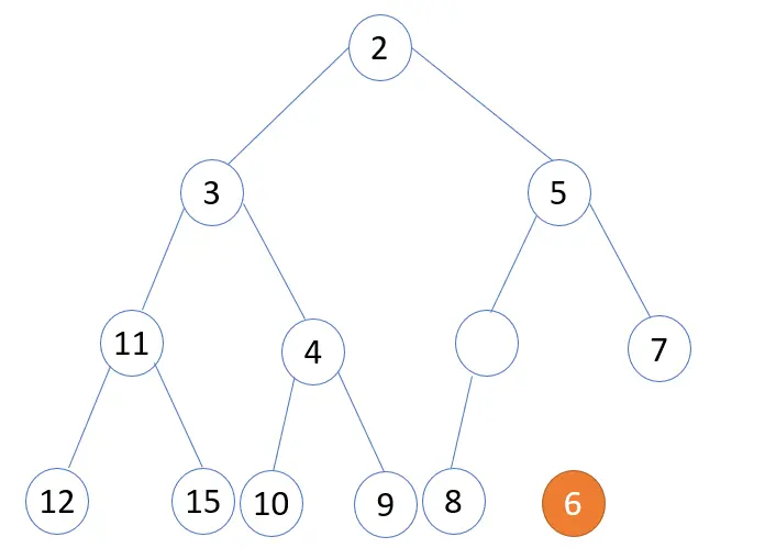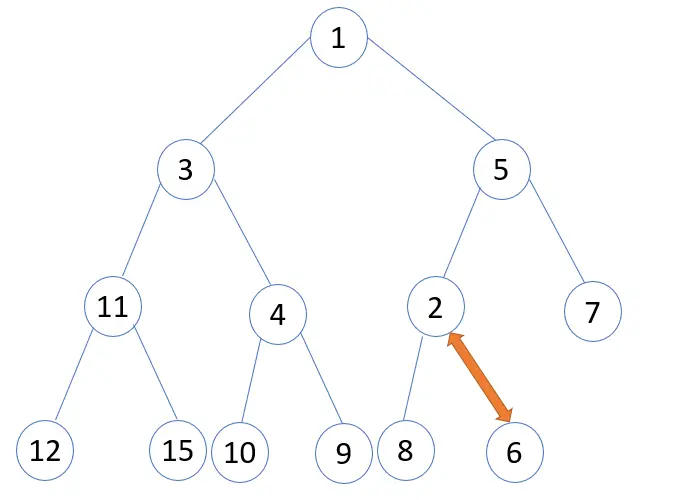 第二次循环:k=2,child=5,c为图中节点5,right=6,经过子节点比较找出较小值5,5与末位置节点6相比,末位置更大,与左子节点交换位置