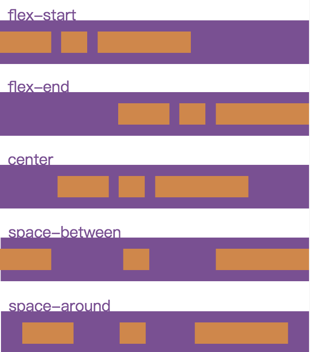 justify-content: flex-start | flex-end | center | space-between | space-around;