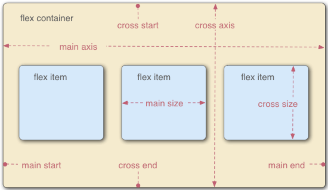 项目默认沿主轴排列。单个项目占据的主轴空间叫做main size,占据的交叉轴空间叫做cross size。