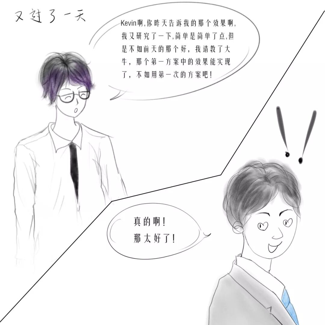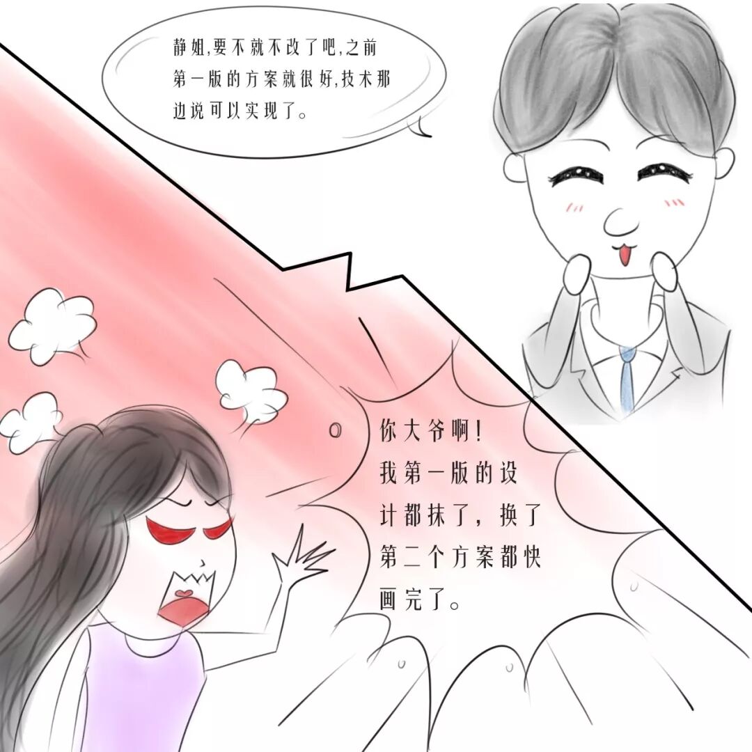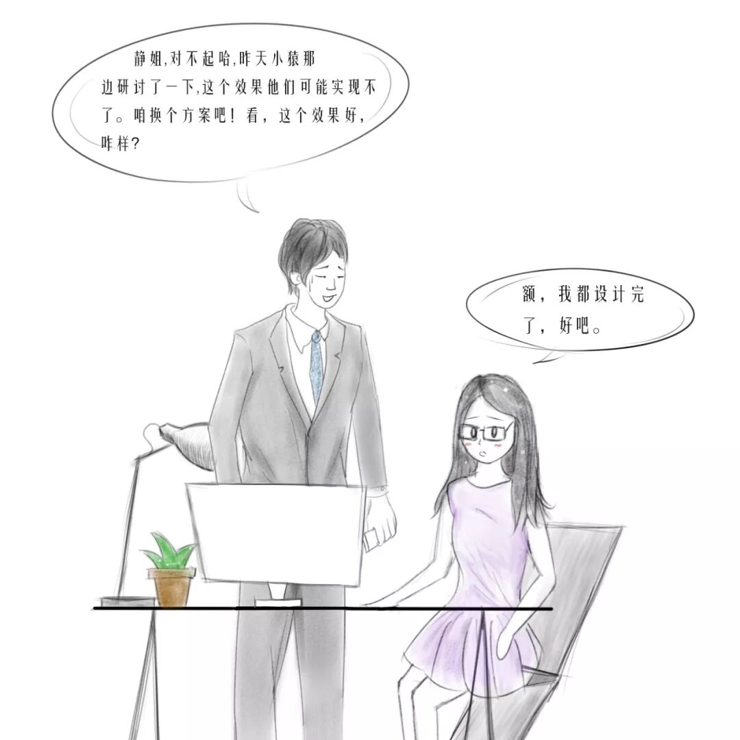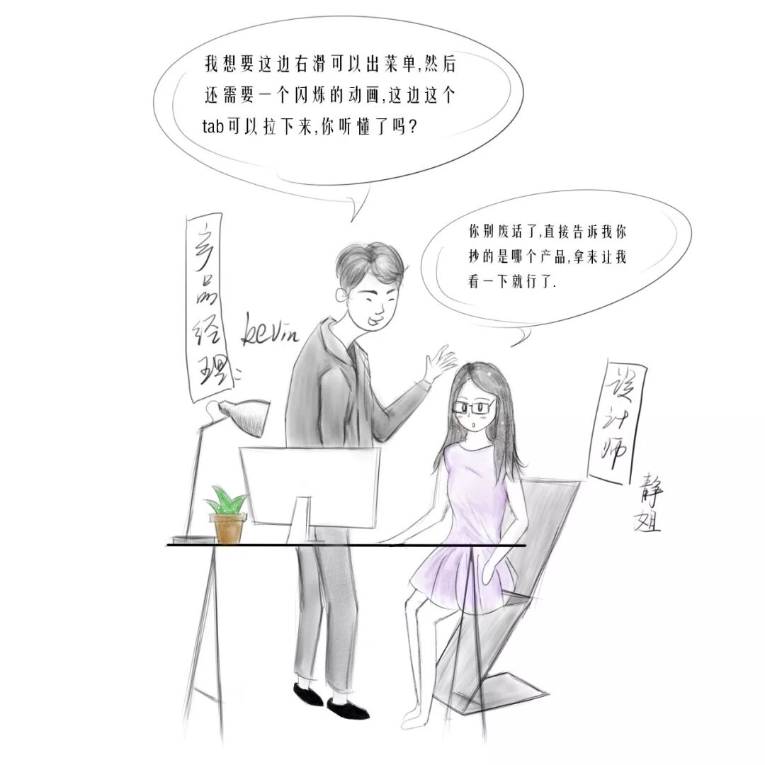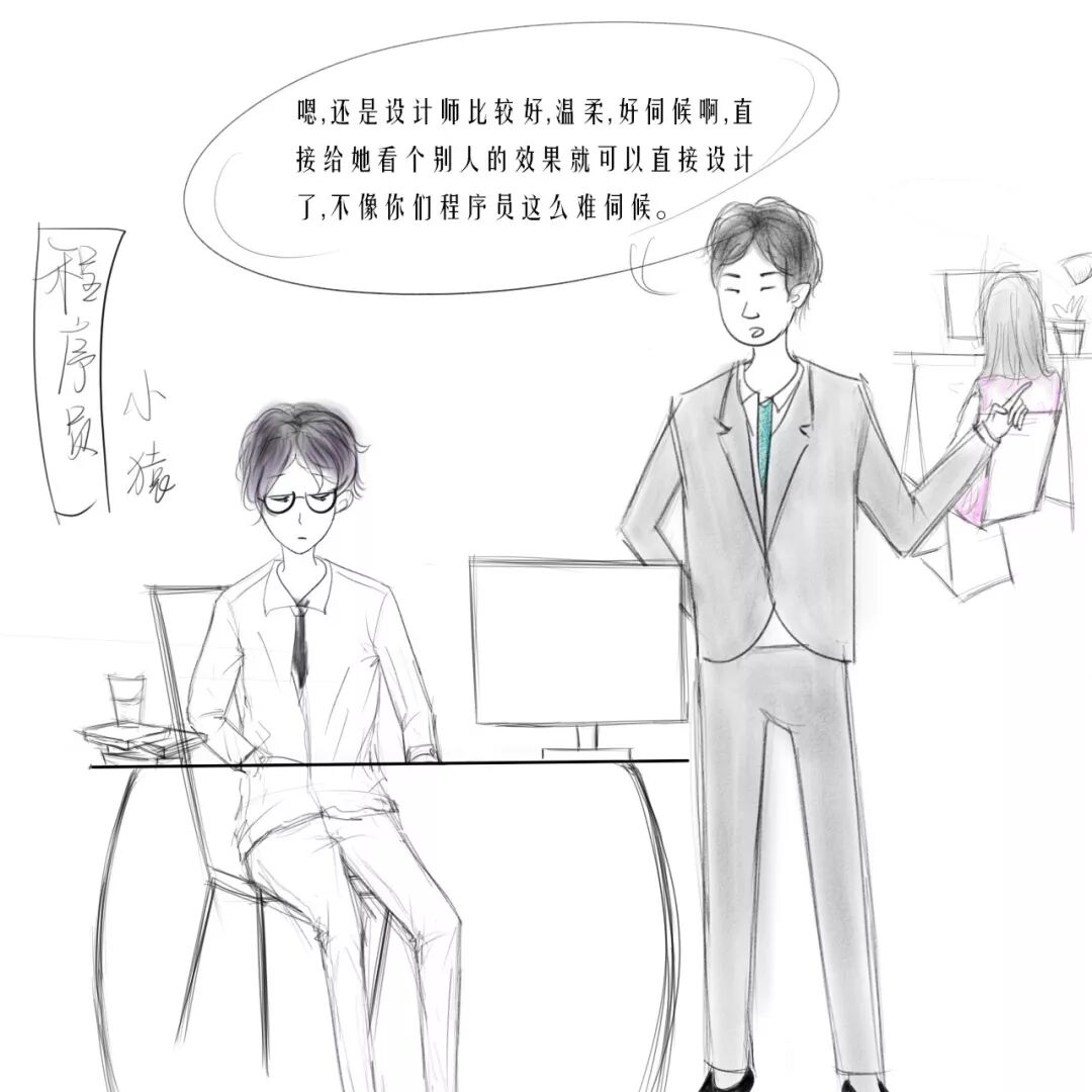 而上面的那幅漫画,是我根据这个产品经理和设计师的对话延伸出来的。为什么要延伸这个对话呢?因为别人在看到这个对话之后,调侃:设计师比程序员好伺候,温柔。