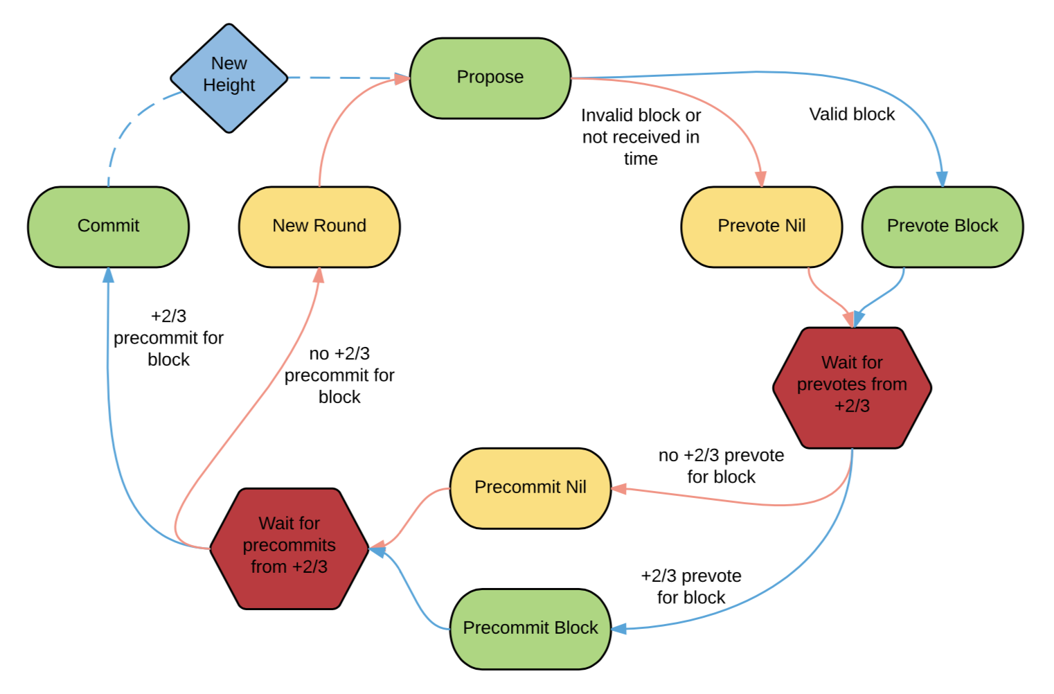 (验证人在发起提议(proposal)步骤之后,当且仅当收到其它验证人超过三分之二(+2/3)的投票后才会进一步推进流程。虚线箭头表示进入下一个区块高度共识流程的原子广播。)