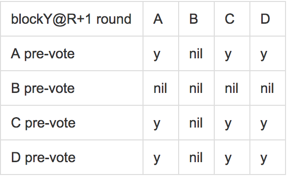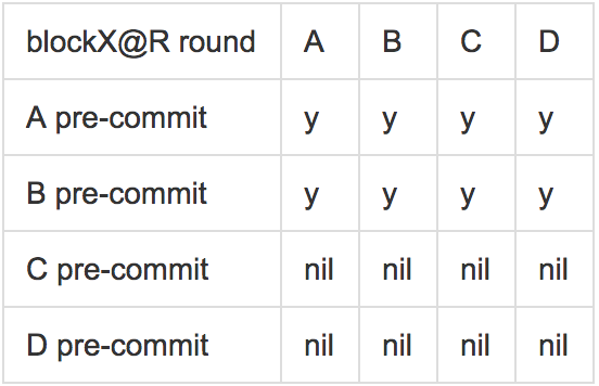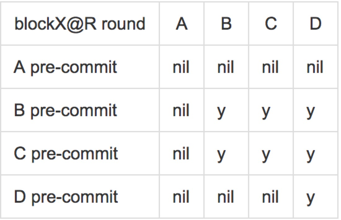 这些规则可以以例子的形式被更直观的理解。考虑4个验证者,A,B,C,D,假设有一个第R轮关于blockX的提议。现在假设blockX已经有一个波尔卡,但是A看不见它,预提交(pre-commit)为空,然而其他人对blockX进行了预提交。进一步假设只有D看见了所有的预提交,然而其他人并没有看见D的预提交(他们只看见他们的预提交和A的空预提交)。D现在将要提交(commit)这个区块,然而其他人进入到R+1轮。由于任何验证者都可能是新的提议者,如果他们提议并投票了一个新的区块blockY,他们可能提交这个区块。可是D已经提交了bockX,因此损害了系统的安全性。注意,这里并没有任何拜占庭行为,仅仅是不同时性。