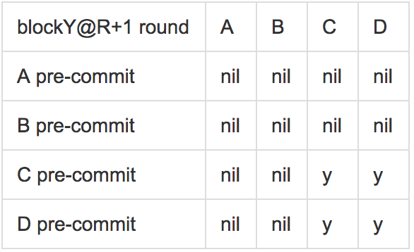 注意到, 如果把m看作一个区块,Tendermint并不满足有效性,因为并不能保证提议的区块最会会被提交,因为验证者可能进入到新的一轮,并提交一个不同的区块。