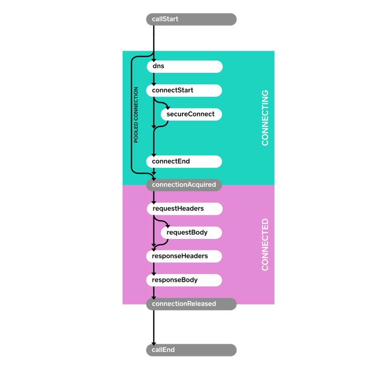 OkHttp具有弹性, 可以自动从连接故障中恢复。 这种情况下, connectFailed()不是终点, 且后面没有callFailed()。 在尝试重试时, EventListener将会接收多个同类型的事件。单个请求调用可能需要后序的请求来询问身份验证, 重定向, 和Http层面的超时。 在这种情况下, 多个连接请求和响应会发生。后序请求是可能会收到多个同类型事件的原因。