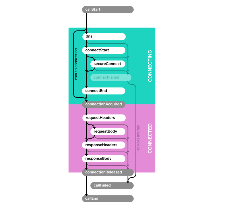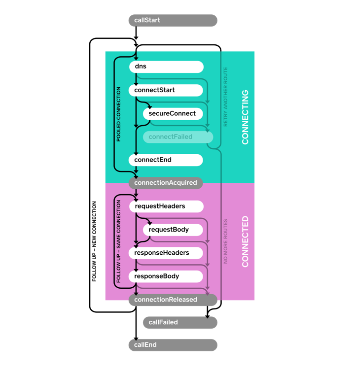 OkHttp is resilient and can automatically recover from some connectivity failures. In this case, the connectFailed() event is not terminal and not followed by callFailed(). Event listeners will receive multiple events of the same type when retries are attempted. A single HTTP call may require follow-up requests to be made to handle authentication challenges, redirects, and HTTP-layer timeouts. In such cases multiple connections, requests, and responses may be attempted. Follow-ups are another reason a single call may trigger multiple events of the same type.