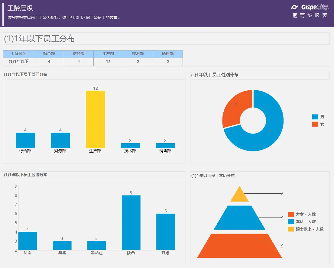 是企业人力资源管理的基础报表,管理当前企业人员的基本信息,如工龄汇总,年龄分析,性别分析,学历结构分析等。通过将不同种类信息划分为多个模块在同一张报表中展示汇总数据,并为最终用户提供钻取的功能。
