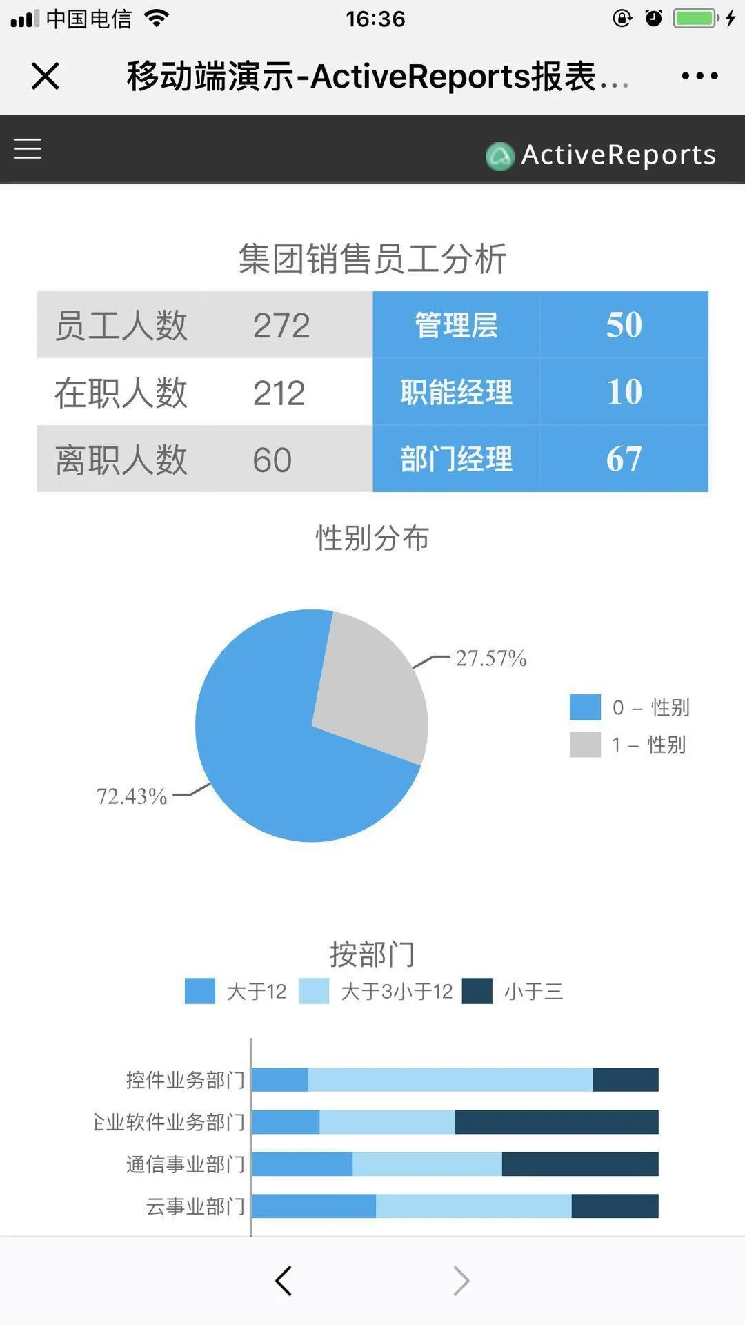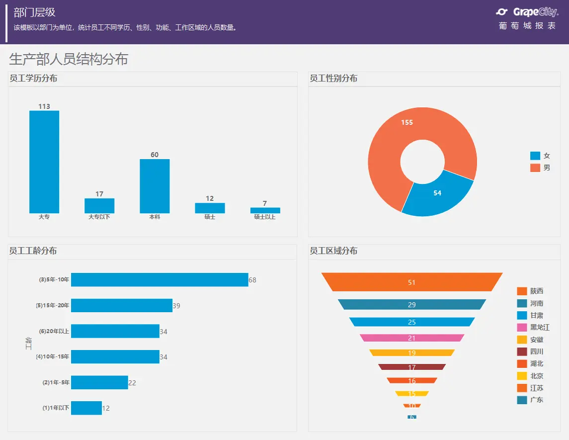 各部分人员信息除了管理层最为关心为,各部门经理也是最为关注,主要分析部门内人员的基本信息,面临的用户则为部门经理,细化部门数据。