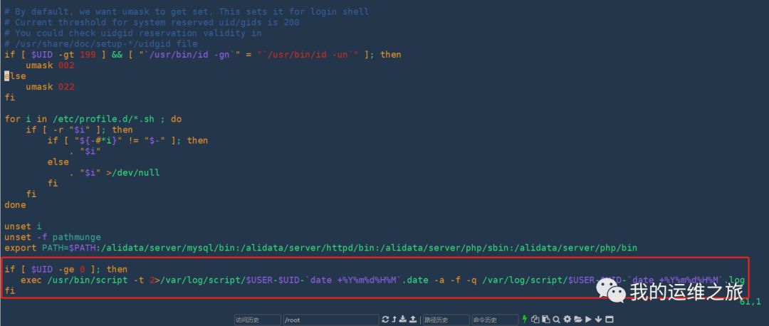 [root@aliyun ~]# vim /etc/profileif [ $UID -ge 0 ]; then exec /usr/bin/script -t 2>/var/log/script/$USER-$UID-`date +%Y%m%d%H%M`.date -a -f -q /var/log/script/$USER-$UID-`date +%Y%m%d%H%M`.logfi