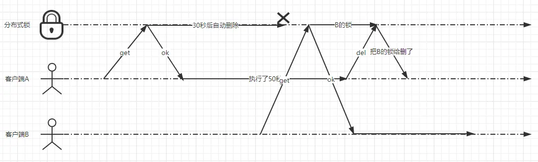 - 客户端A从阻塞中恢复过来,释放掉了客户端B持有的锁。