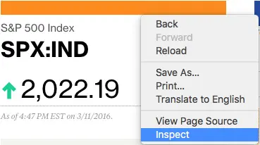 因为有些人会关注股市,那么我们就从这个页面上获取指数名称(标准普尔 500 指数)和它的价格。首先,从鼠标右键菜单中点击 Inspect 选项来查看页面。