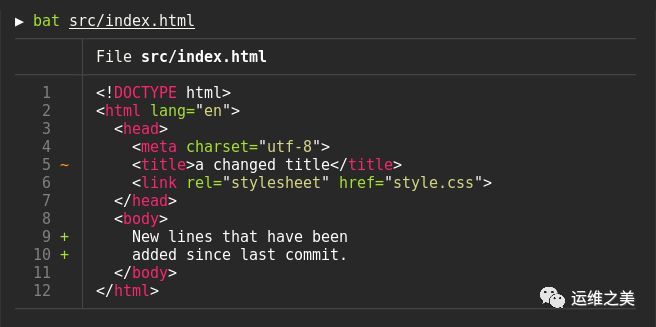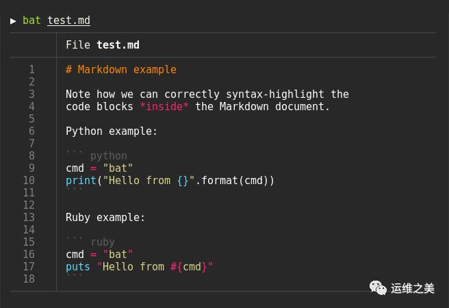 bat 是命令行下一款用来显示文件内容的工具,bat 命令功能跟常用命令 cat 类似。只是 bat 功能上更加强大一些,bat 在 cat 命令的基础上加入了行号显示、代码高亮和 Git 集成。