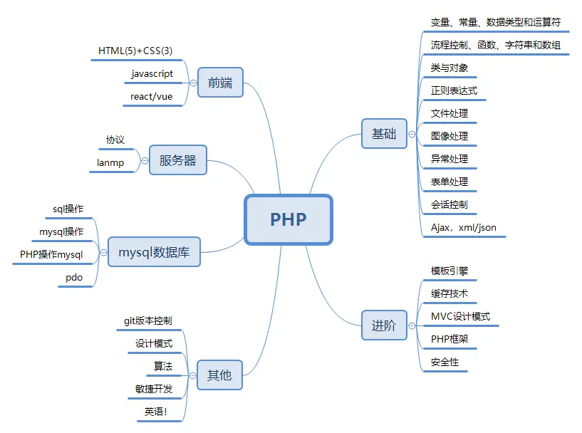 这里我借助xmind脑图工具,整理了一下PHP的基本的知识体系。(网上有列的更详细全面的版本)