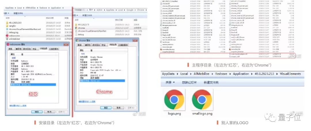 另一位微博用户 @泷涯 直接安装了红芯浏览器,他写道:“安装完成后,我打开了安装目录。然后我就被雷到了:要不要那么明目张胆?文件结构基本上一模一样,甚至于“属性”里的Chrome都没有改掉?”