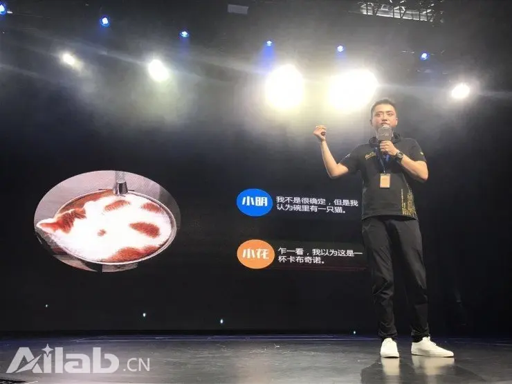 我们先做这样一个测试(看PPT图片)。左边是一只猫,右边有两句话。如果你看到这张图你会怎么理解?你问一个人还是一个机器会得出不一样的答案。