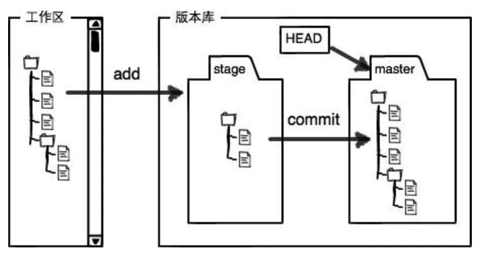 目录.git,是Git的版本库。Git的版本库里存了很多东西,其中最重要的就是称为stage(或者叫index)的暂存区,还有Git为我们自动创建的第一个分支master,以及指向master的一个指针叫HEAD。