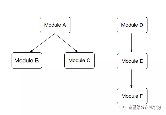 SOFABoot 会根据 Require-Module 和 Spring-Parent 计算模块依赖树,例如以下依赖树表示模块B 和模块C 依赖模块A,模块E 依赖模块D,模块F 依赖模块E: