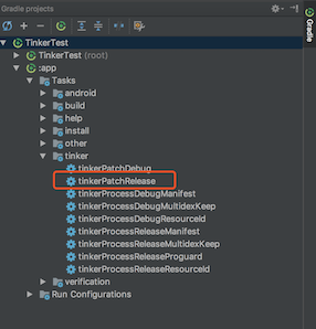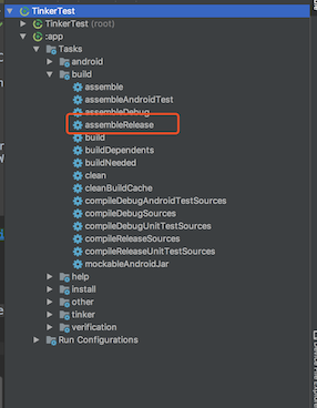 ./gradlew tinkerPatchRelease打补丁包。当然你也可以直接在AS右侧的Gradle中找到你的应用,并在Tasks->tinker->tinkerPatchRelease找到tinkerPatchRelease的任务,双击执行任务。