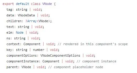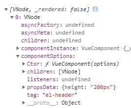 接下来是如何判断子元素是<el-header>或者<el-footer>,这里首先要明确this.$slots.default是个数组,里面的每个元素都是一个VNode,VNode是虚拟dom中的虚拟节点,当组件被编译时,每个<...>就会生成一个虚拟的节点,大致结构如下图