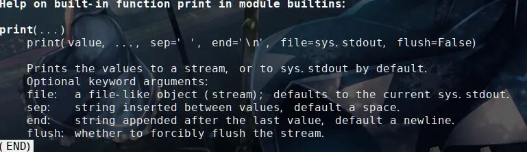 print(value, ..., sep=' ', end='\n', file=sys.stdout, flush=False)