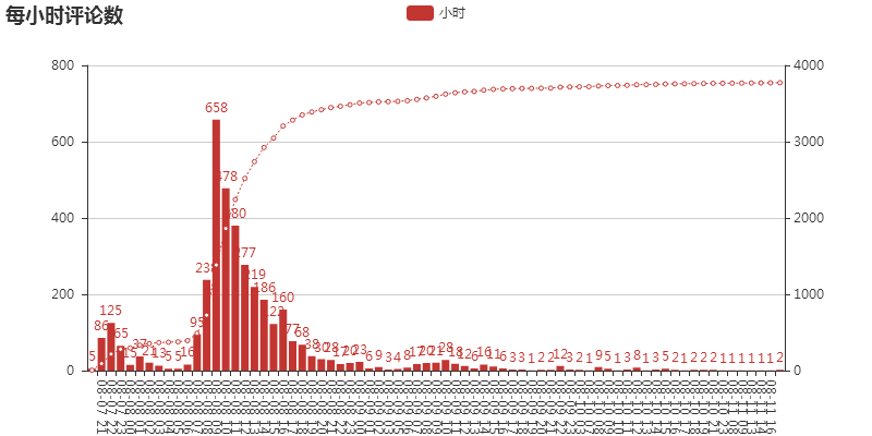 可以看到组合图里,柱形图似乎没什么问题,最早的评论出现在8月7号的晚上8点,最大的高峰出现在在8月8号上午9点,单小时评论数高达659条,之后逐渐衰减;