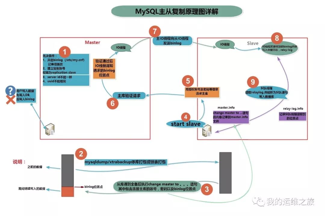 从库通过手工执行change master to连接主库,提供了连接的用户条件(user、password、port、ip),并且让从库知道binlog的起点位置(file名、position号);