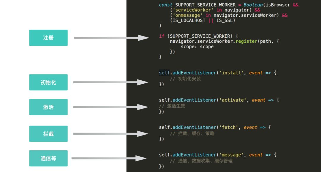 Service Worker 是基于事件的,安装、激活、缓存、通信等操作都是需要在特定事件下操作,包含以下几个主要事件。