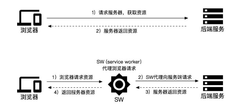 Service Worker 会拦截浏览器所有请求,并查询当前 cache,如果存在 cache 则直接返回,若不存在,则通过 fetch 方法向服务端发起请求,并返回请求结果给浏览器。