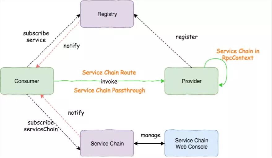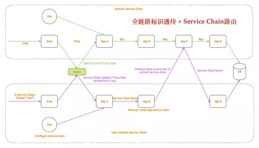 面那条线我们称为“基础环境”链路,下面那条线我们称为“SC 环境”链路,当标识透传到下一个服务的时候,如果没有找到对应 sc 应用节点,会默认走标准环境,如果有对应的节点,走 sc 环境的应用节点,整个过程 SC 标识从一开始的 Web 端 http 请求传入,就一直透传下去。