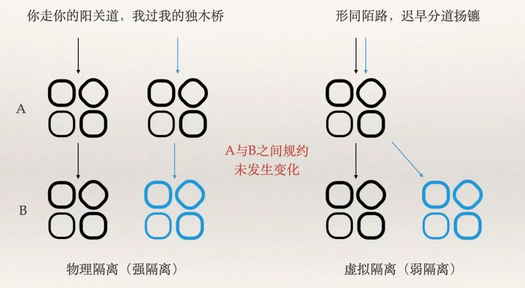 强隔离:优点,隔离性强,不用修改应用,对应用侵入性低;缺点,运维成本高