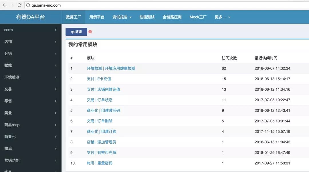 环境数据 mock 平台---测试团队目前开发覆盖了包括大数据,交易,支付等 14 块业务 mock 场景,大大提升了测试环境的高效便捷;比如测试环境有些特殊的场景是需要数据构造的,店铺没钱了,e卡支付账号没钱了,添加店铺管理员等,都可以通过测试平台自己实现。