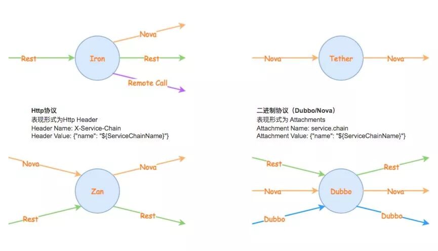 全链路标识透传,那就要求入口发起的请求,无论是哪种业务应用或者何种协议,何种框架,都必须将源端的 SC 标识透传下去,如果其中任何一个环节标识透传失败,就没有意义了;这里主要讲下两种主要协议的标识透传: