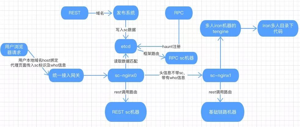 首先针对不同的环境,本地需要绑定 host,域名需要接入统一网关,接着通过 Web 代理页面,给浏览器 http 访问 header 头带上 Iron 访问多人路径名 who 信息、SC 标识信息必要信息,最后在代理页面选择入口机器(ps:多人 Iron 机器),就可以开始 SC 调用之旅了;Iron 服务我们不同环境只有一台服务,在机器上建立多人路径名,通过 who 信息由 Tengine 走到各自的路径 Iron 代码,这样我们就解决了 Iron 入口的问题;接下来 Iron