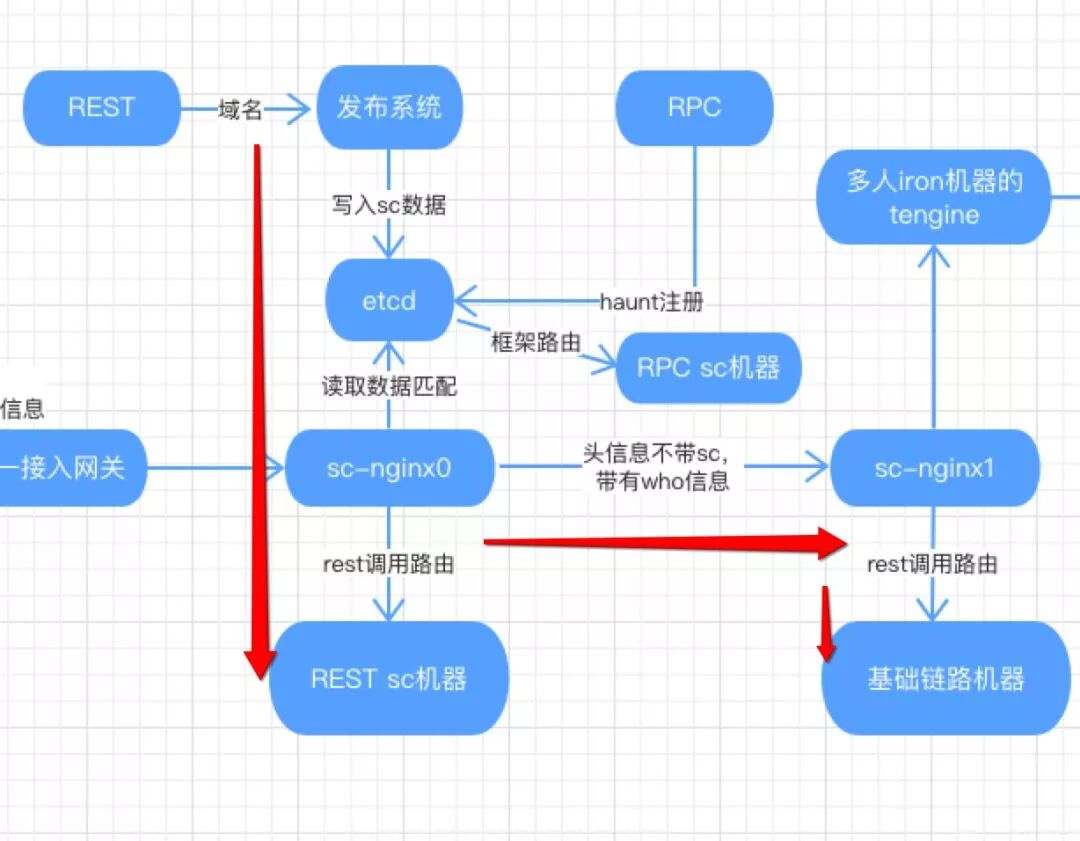 尽量做到命名简单统一规范,再通过 Web 发布平台将应用带有 SC 标识的 rest 服务信息写入到 etcd;接下来很重要的一步,实现 rest sc 路由,做法是部署一台专门干这个活的机器, 这里称为 sc-nginx0 机器;rest 通过域名调用都会走到 sc-nginx0,sc-nignx0 再通过 Nginx 配置做全应用名称模糊匹配,从而转发到对应的应用 rest sc 服务节点,这样就实现了 rest 调用标识透传。需要注意的是如果路由不上,会走到兜底的 sc-nginx1