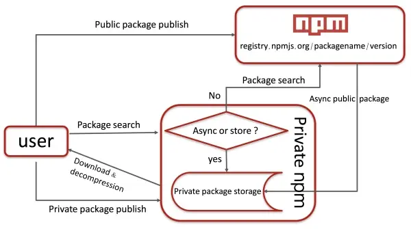 用户install后向私有npm发起请求,服务器会先查询所请求的这个模块是否是我们自己的私有模块或已经缓存过的公共模块,如果是则直接返回给用户;如果请求的是一个还没有被缓存的公共模块,那么则会向上游源请求模块并进行缓存后返回给用户。