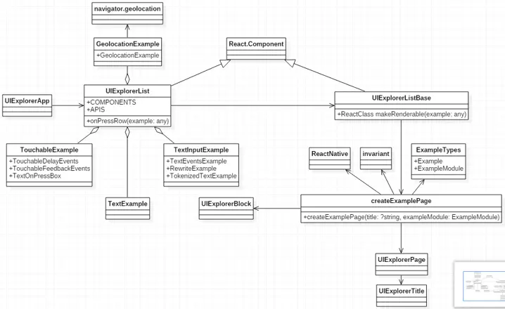 上图是根据源码分析画出图,通过此图我们可以了解到该应用的全局构成,UIExplorerList管理了全部的UI和功能组件,通过UIExplorerListBase中的ListView的onpress方法切换不同功能组建,createExamplePage会渲染出所选择的UI及功能组建视图,在下图中去掉了TextExample中对UIExplorerBlock和UIExplorerPage的使用关系,因为例子中的使用关系我们可以通过export方式来实现。