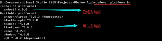 可通过命令 cordova platform ls 显示已经安装的平台项目以及可安装的平台