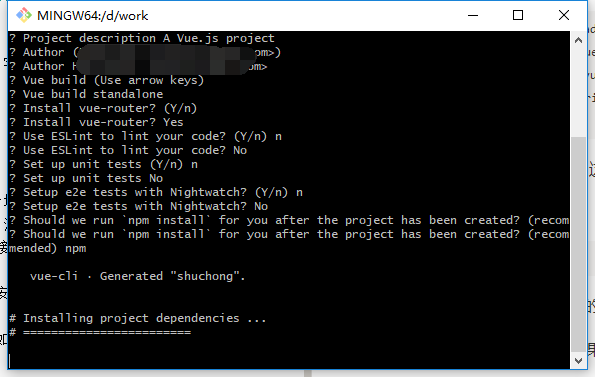 - Setup e2e tests with Nightwatch?是否安装e2e来进行用户行为模拟测试,我们这里不需要,所以输入n。