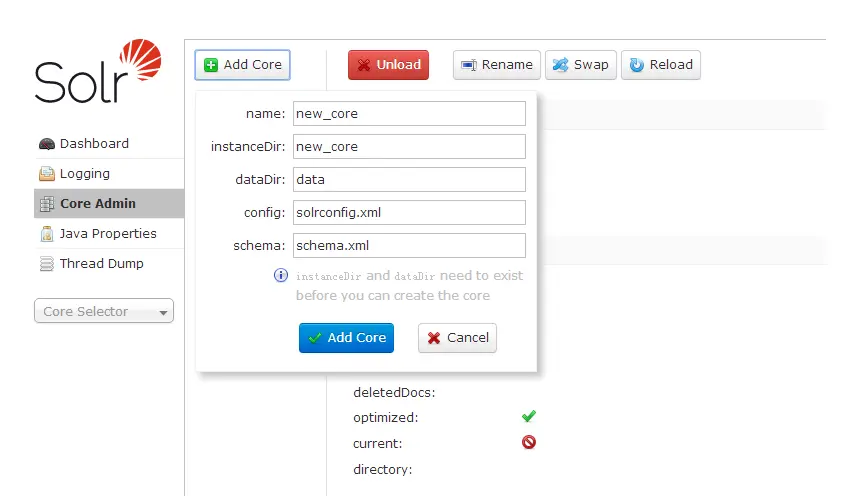 点击Core Admin菜单,如果没有Core,会弹出如下框,提示添加。