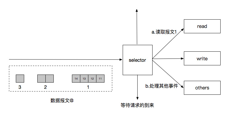 我们在数据的读取这一步遇到了阻塞原因是BIO需要等待数据读取完,比如1,2,3中,等待3被读取,NIO突破口在这,它只需要读完连续的数据包即例子中的1就直接返回去处理其他事件而不用阻塞了,但是后面的数据包2,3来的时候如何处理,此时就需要我们的观察者模式了,当探查到2,3到来的时候,可以让某个对象发出通知给读取者继续读取,这个对象就是所谓的