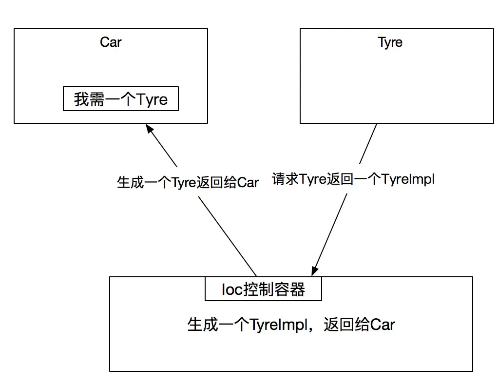 - 如果在Car内部自己去new一个Tyre的资源(如B所示),那么Car就和Tyre产生了前的依赖,既Car->Tyre。如果Tyre的型号发生了改变,那么Car的代码就需要跟随发生改变。