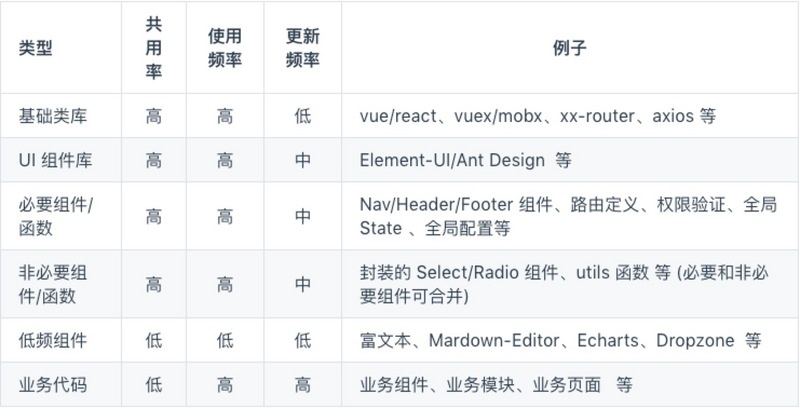 理论上 UI 组件库也可以放入 libs 中,但这里单独拿出来的原因是: 它实在是比较大,不管是 Element-UI还是Ant Design gizp 压缩完都可能要 200kb 左右,它可能比 libs 里面所有的库加起来还要大不少,而且 UI 组件库的更新频率也相对的比 libs 要更高一点。我们不时的会升级 UI 组件库来解决一些现有的 bugs 或使用它的一些新功能。所以建议将 UI 组件库也单独拆成一个包。