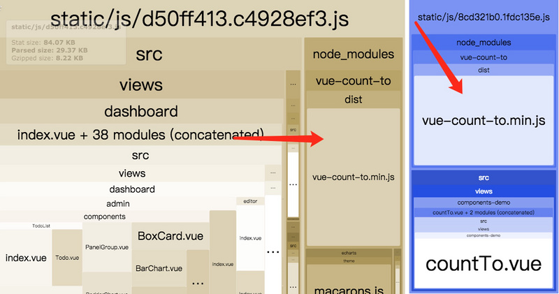 但有一些小的组件,如上图:vue-count-to 在未压缩的情况下只有 5kb,虽然它被两个页面共用了,但 webpack 4 默认的情况下还是会将它和那些懒加载的页面代码打包到一起,并不会单独将它拆成一个独立的 bundle。(虽然被共用了,但因为体积没有大于 30kb)