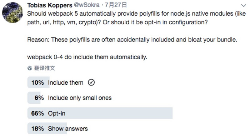 同时 webpack 的团队已经承诺会通过投票的方式来决定一些功能。比如不久前发起的投票。