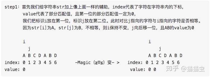 上面计算字符串的部分匹配表的方式需要把所有搜索词的前缀后缀都写出来,然后再查重,再找出重复元素中最长的字符串数出它的长度才能知道其部分匹配值,想象一下你要把这一步骤用代码实现出来。。。