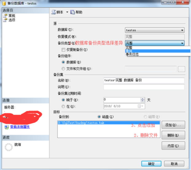 2、在备份数据库弹出框中-》选择备份类型为差异-》然后删除系统生成的目标文件-》然后点击添加。