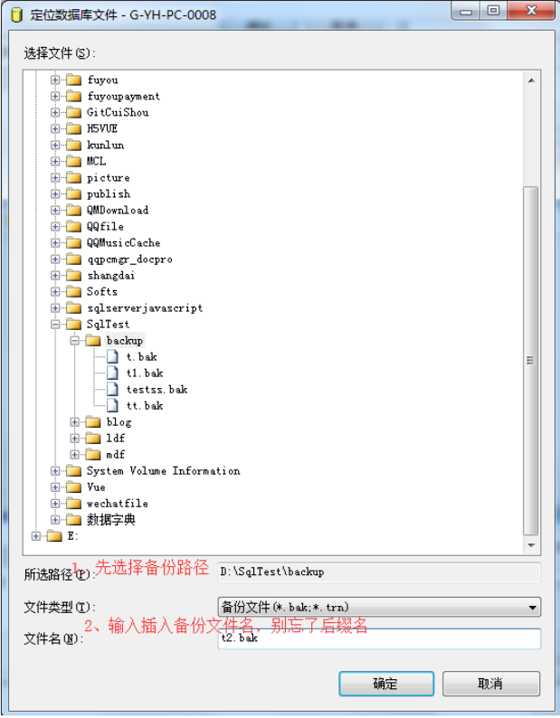 4、在定位数据库文件弹出框中,先选择需要备份的文件路径,然后数据备份文件名,点击确定。