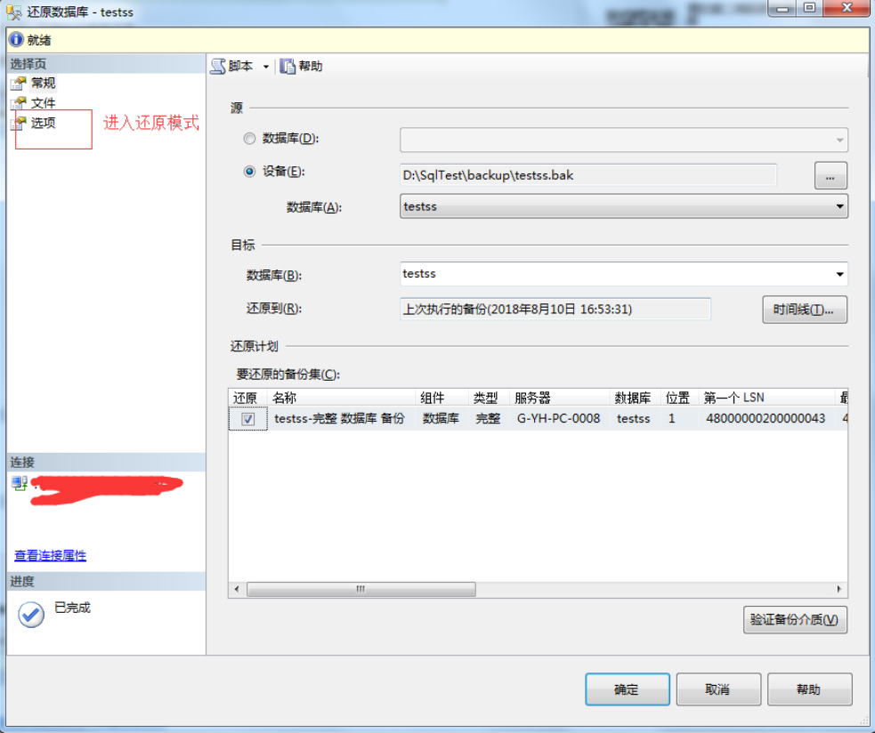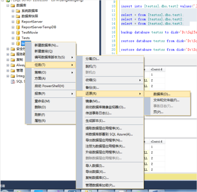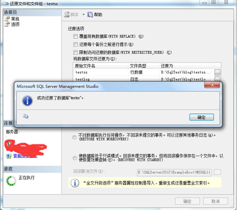 语法: 第一步先指定数据库恢复模式:restore database 数据库名 from disk=数据库文件 with norecovery ; 第二步再恢复差异备份:restore database 数据库名 from disk=差异文件 with recovery; 示例: 第一步先恢复备份数据库:restore database testss from disk='D:\SqlTest\backup\testss.bak' with norecovery ; 第二步再恢复差异备份:restore database testss from disk='D:\SqlTest\backup\t3.bak' with recovery; (注意数据库如果存在,可删除或者使用覆盖先有数据库)
